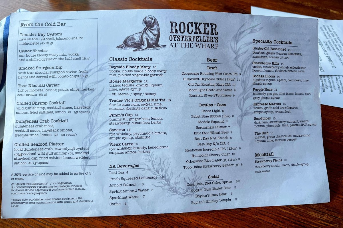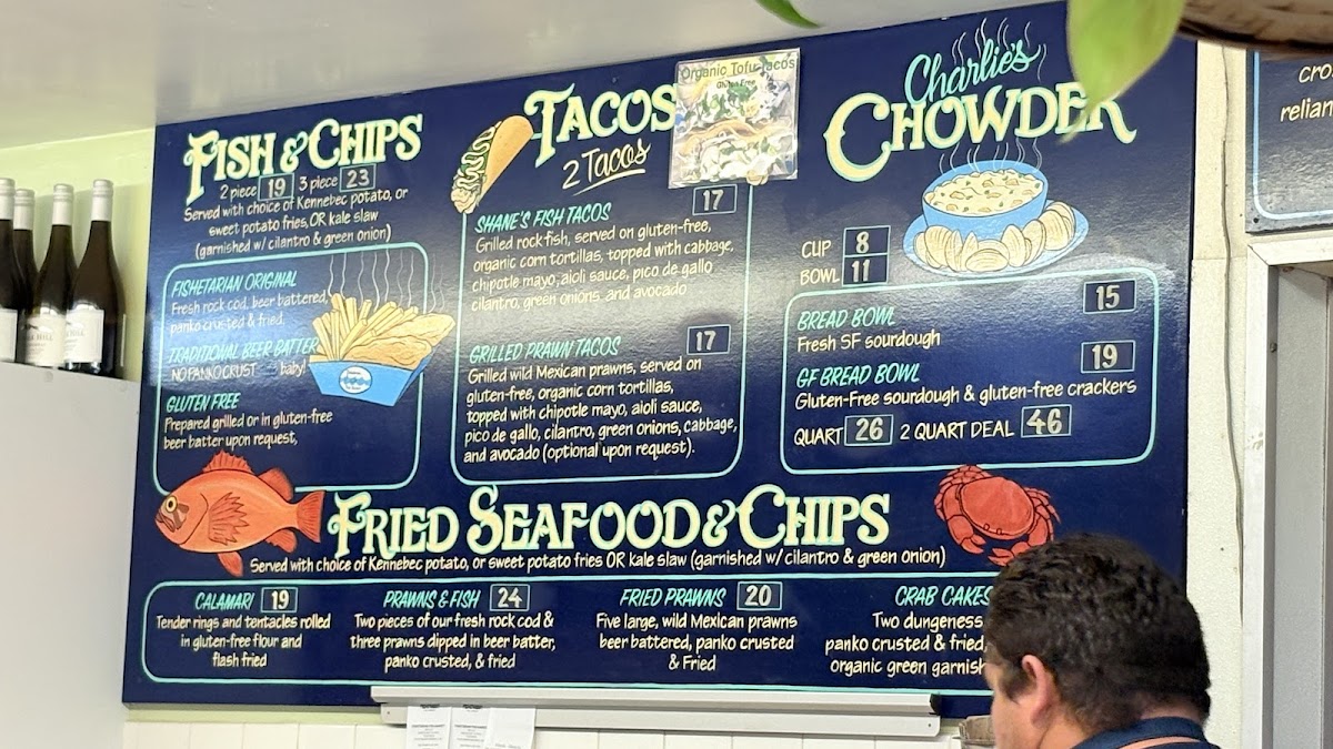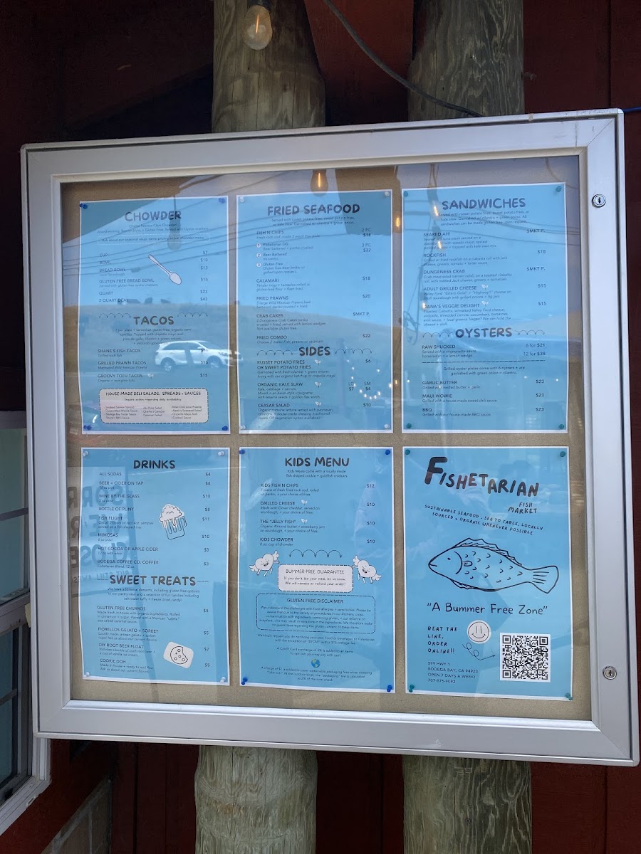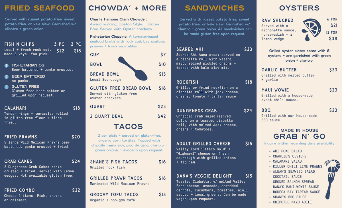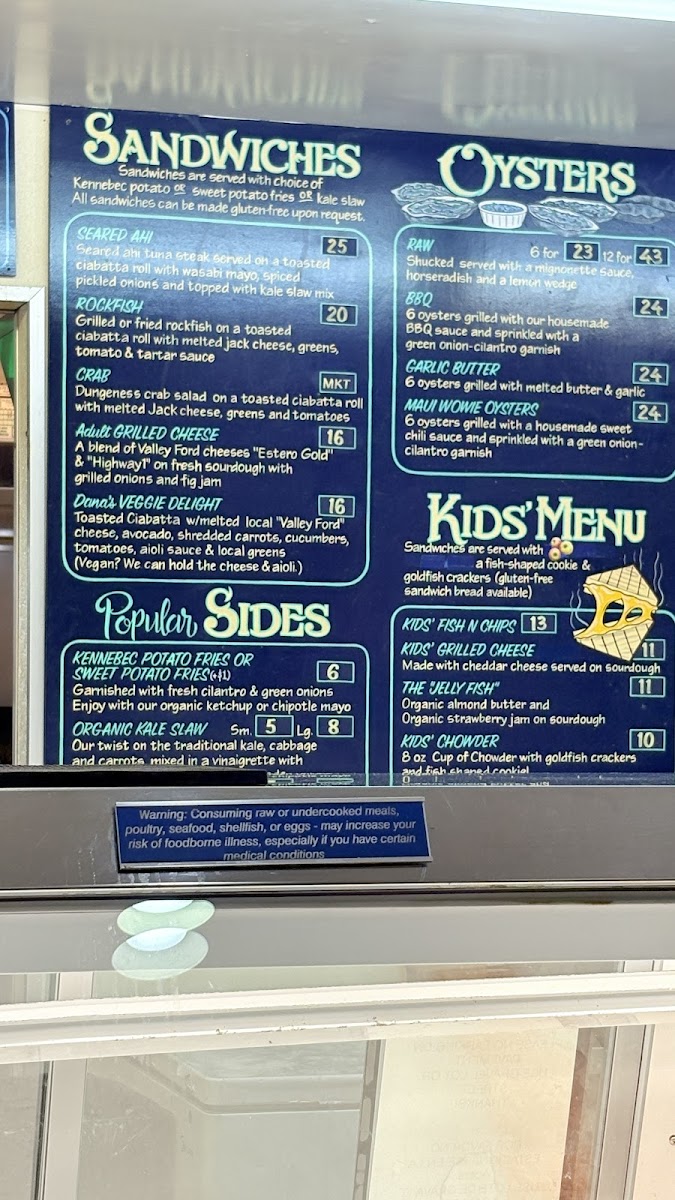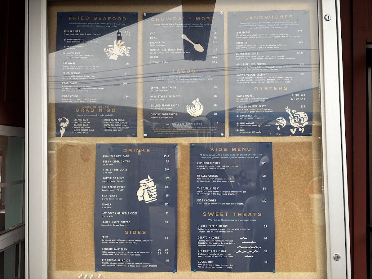The menu features a variety of seafood dishes, sandwiches, and café-style offerings suitable for casual dining at any time of day. It includes freshly prepared items such as clam chowder served in sourdough bread bowls, a selection of fish tacos, and traditional fish and chips with gluten-free options available. Shellfish options include oysters prepared in different styles and Dungeness crab dishes. Sandwiches often come with sides like regular or sweet potato fries and organic kale slaw. Beverage choices include soft drinks like root beer floats and a selection of wines.